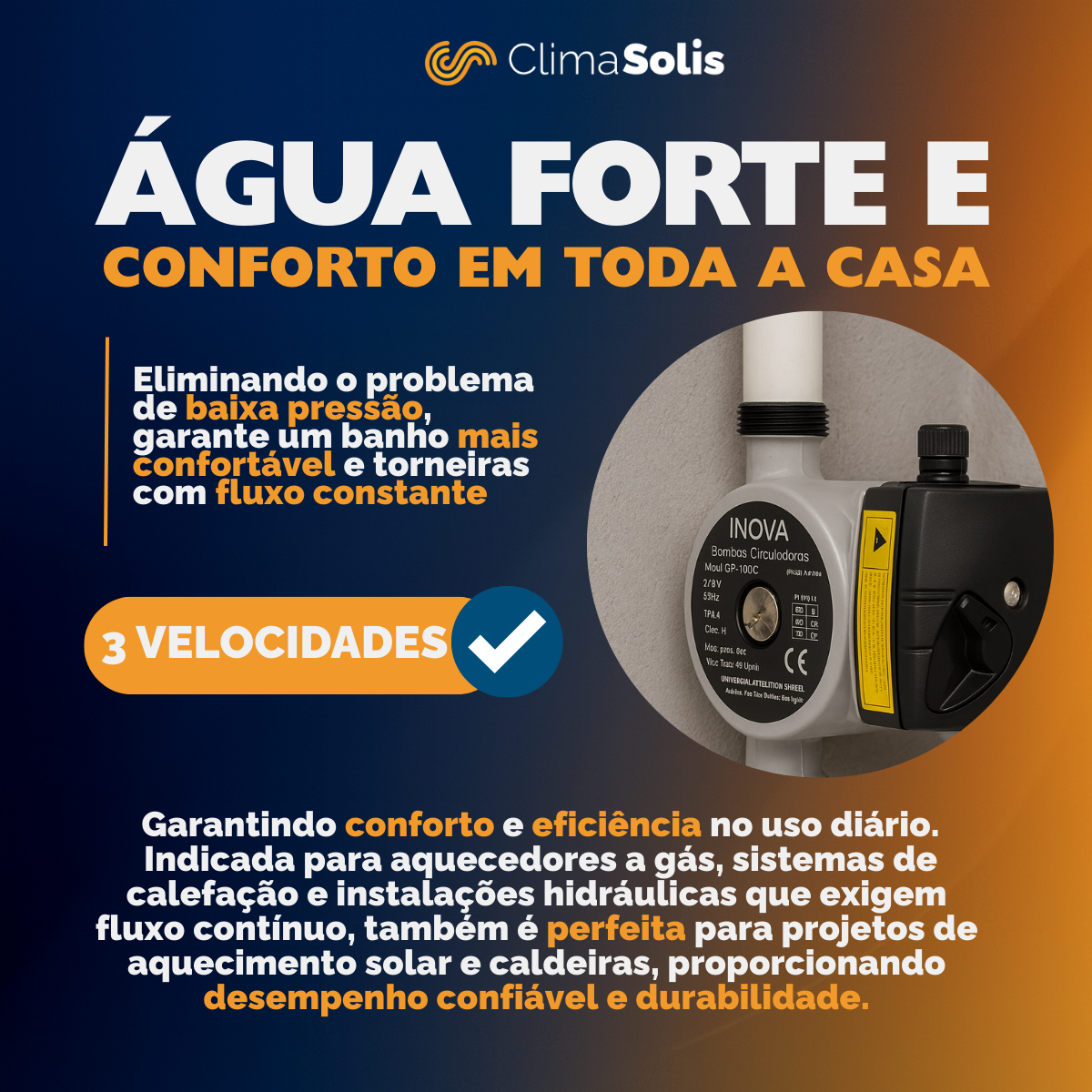 A bomba GP-100CC SS é ideal para circulação de água quente em sistemas de aquecimento solar, aquecedores de passagem, sistemas de calefação e aplicações que exigem confiabilidade e operação contínua.
