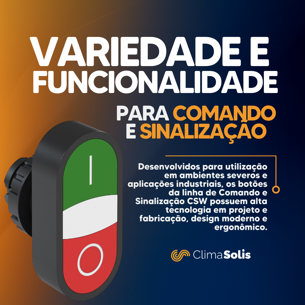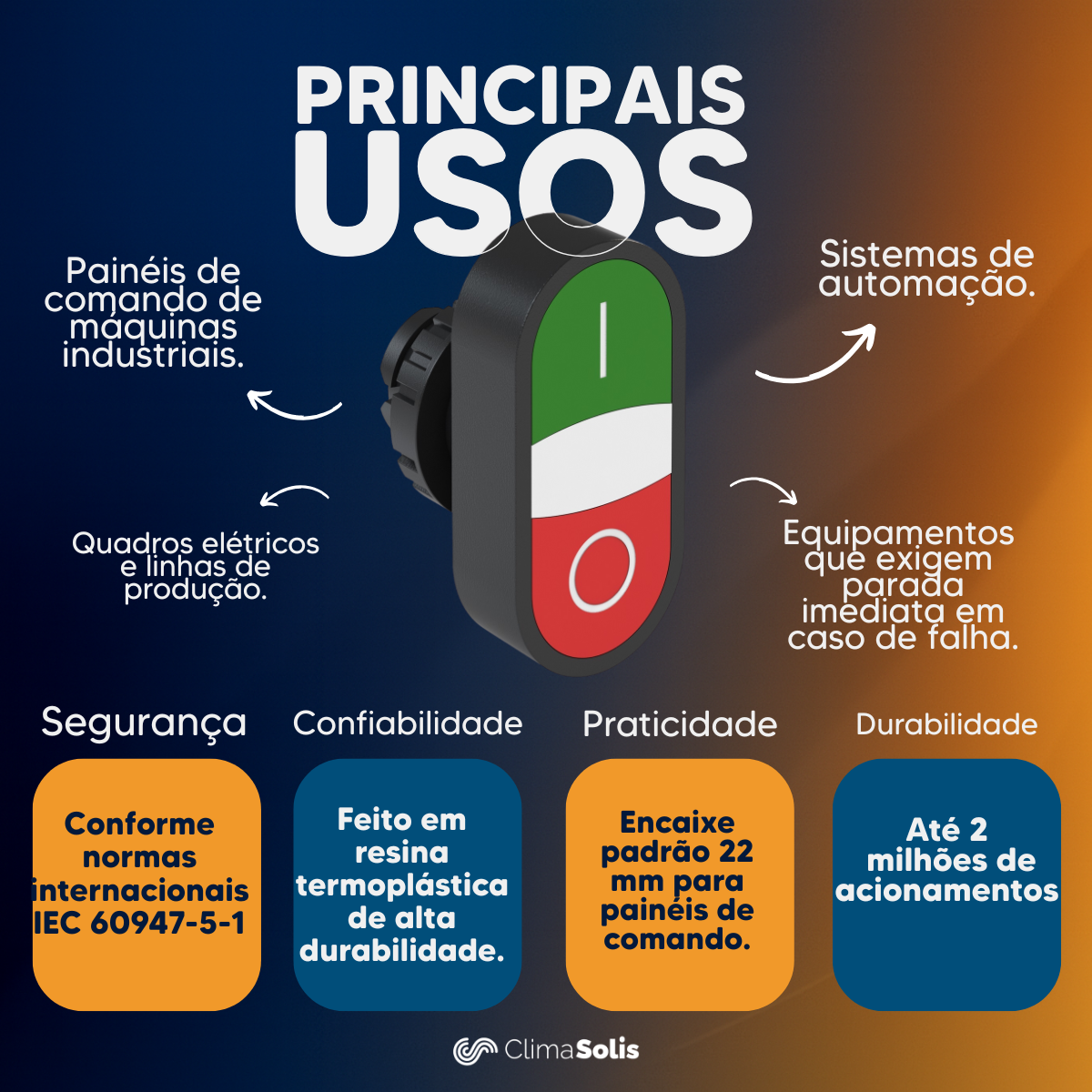 Com tensão de alimentação de 220 a 240 V AC, o botão duplo da linha CSW pode ser utilizado em uma ampla variedade de aplicações, incluindo comandos de motores, máquinas, equipamentos automatizados e sistemas de controle elétrico. Além disso, possui iluminação integrada, facilitando a identificação do estado de cada comando, mesmo em locais com baixa luminosidade.