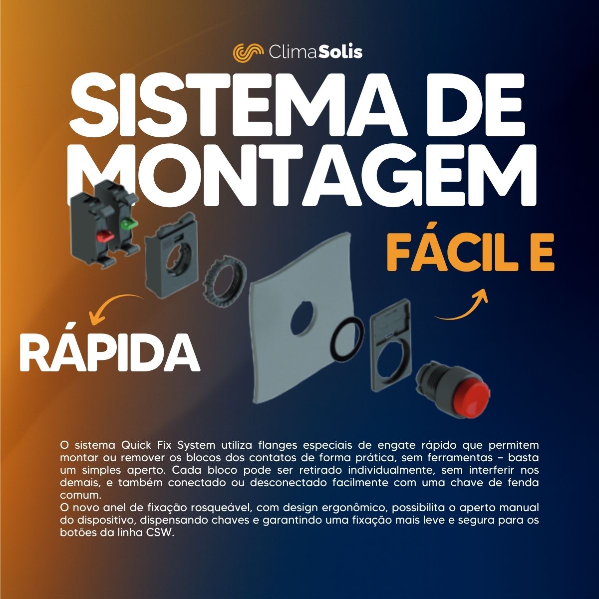 Com instalação simples em orifícios de 22 mm, o botão é compatível com sistemas de montagem rápida e segura, garantindo agilidade no processo de fixação sem a necessidade de ferramentas especiais. Os blocos de contato da linha CSW são fabricados com ligas especiais de prata, assegurando alta confiabilidade mesmo em baixos níveis de corrente e tensão.