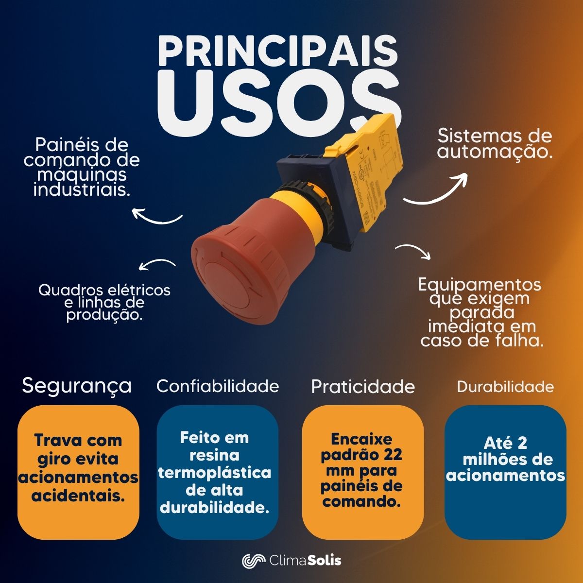 Indicado para painéis elétricos, sistemas de automação e máquinas industriais que necessitam de dispositivos confiáveis de parada de emergência.