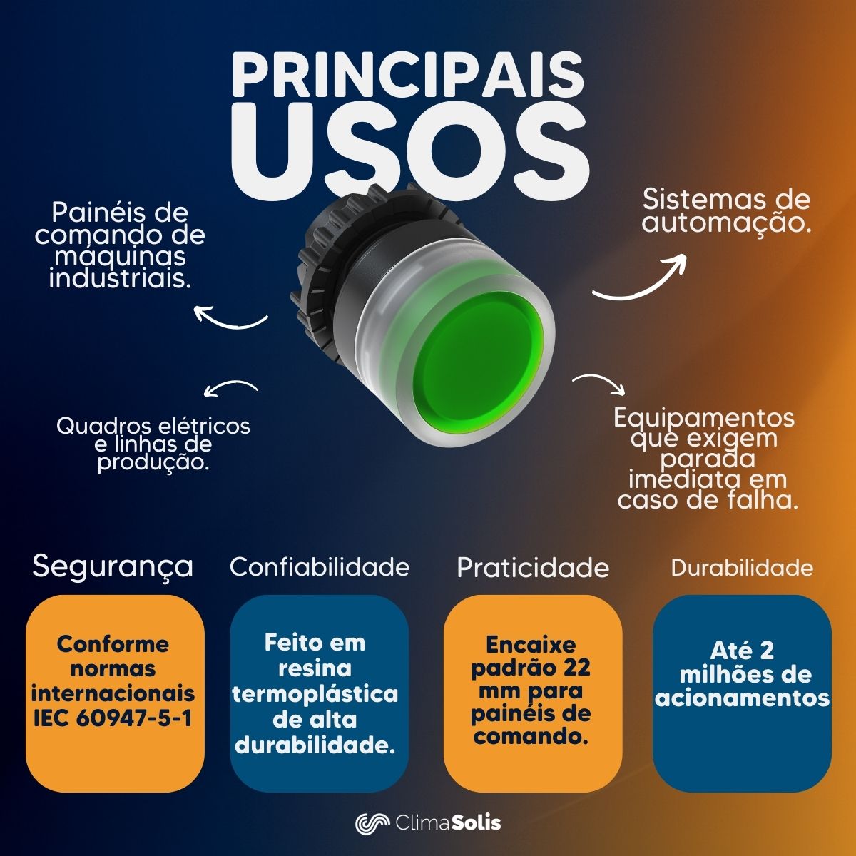 O botão utiliza iluminação em LED, que proporciona alta durabilidade, baixo consumo e excelente luminosidade.