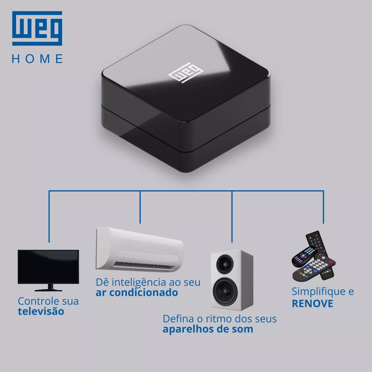 O Controle Universal Wi-Fi WEG WHOME foi desenvolvido para trazer praticidade e inovação ao seu dia a dia. Ele permite unificar todos os seus controles remotos infravermelhos em um único aparelho, possibilitando controlar TV, ar-condicionado, home theater e diversos outros dispositivos diretamente pelo smartphone, de qualquer lugar.