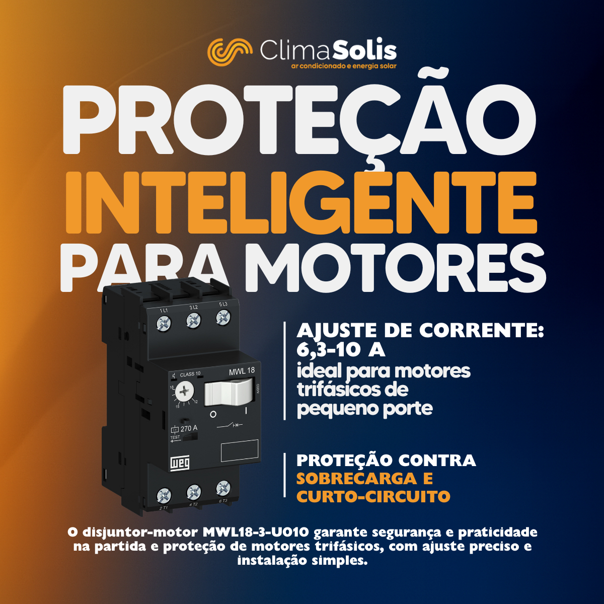O MWL18-3-U010 permite regulagem de 6,3 a 10 A.