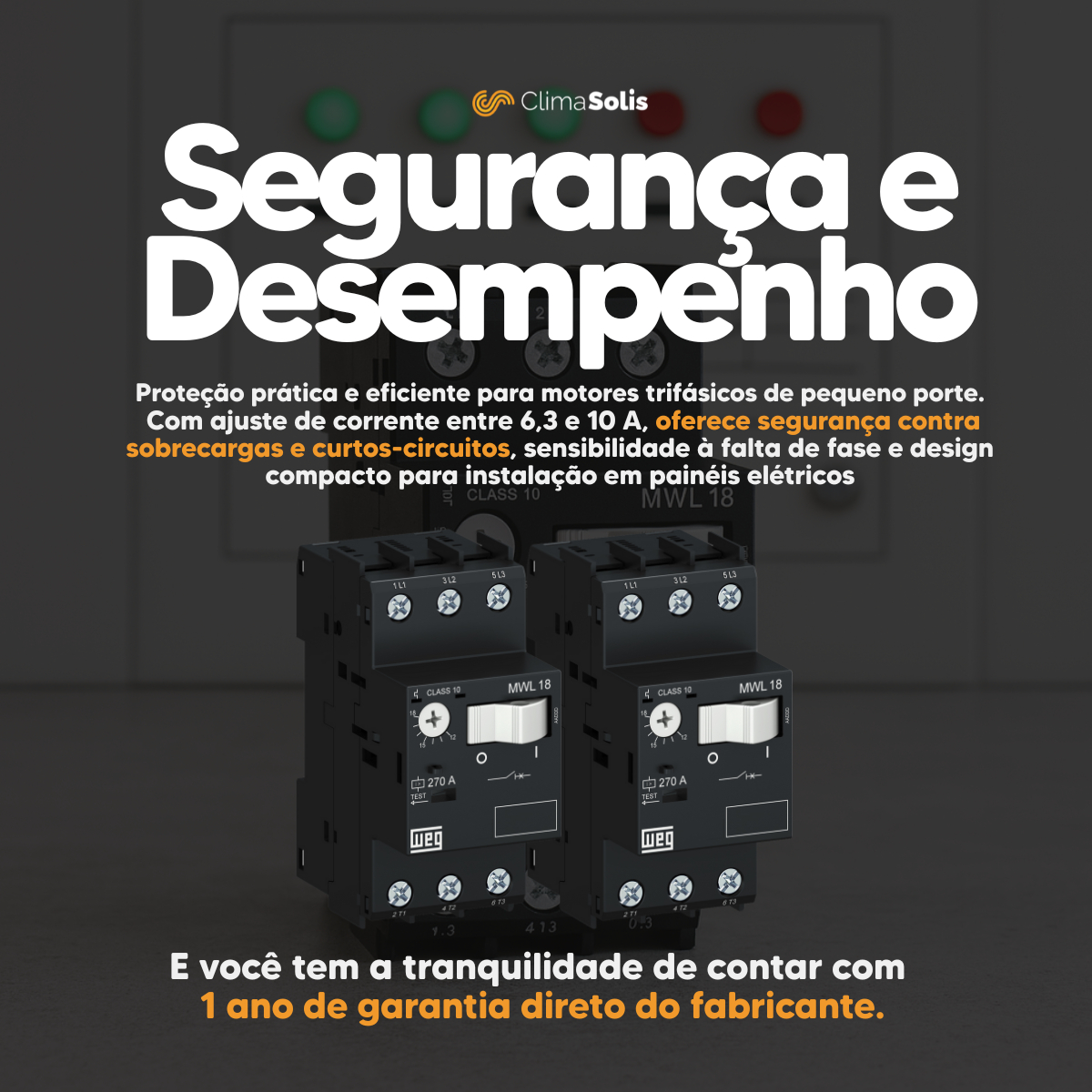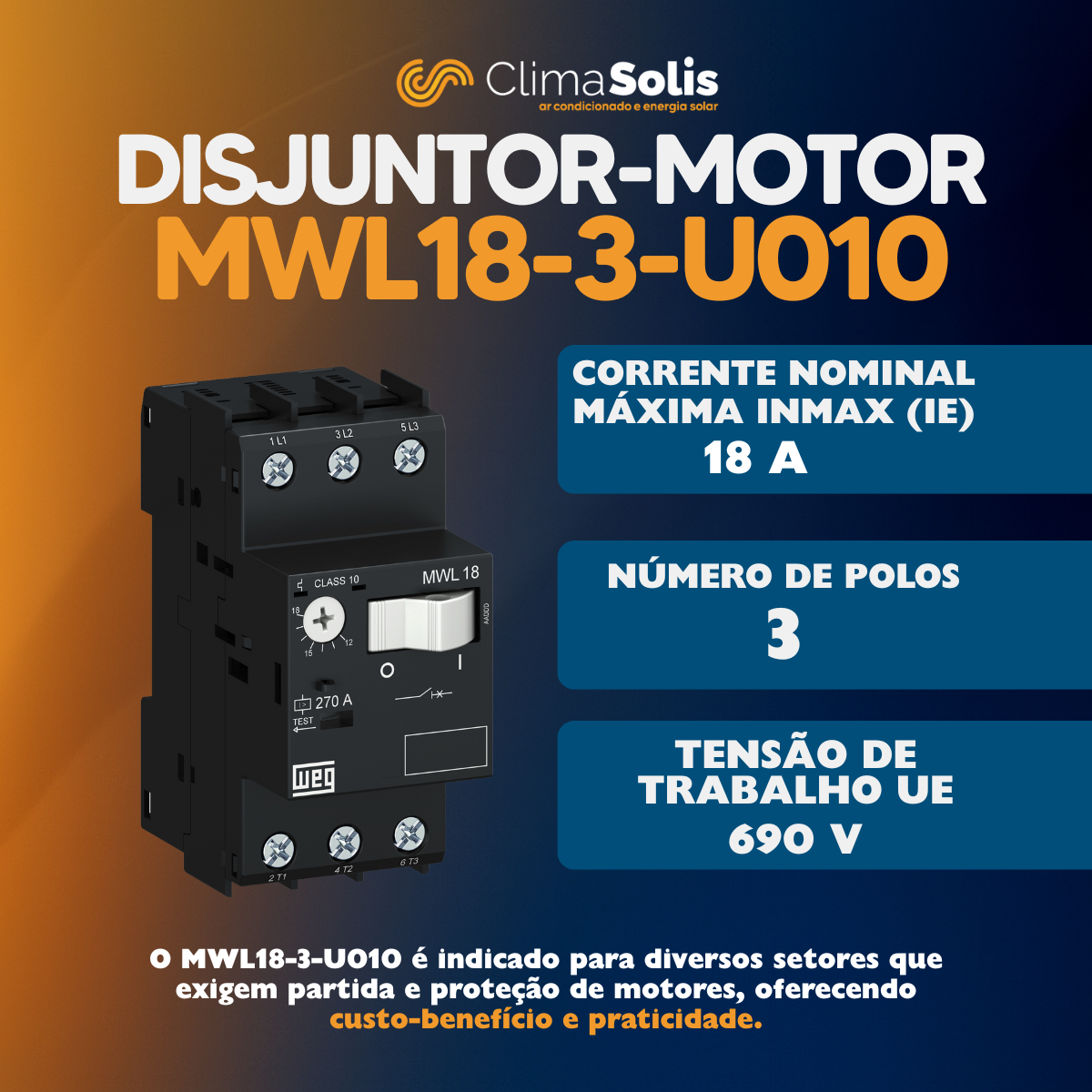 O disjuntor-motor WEG MWL18-3-U010 foi desenvolvido para executar as funções essenciais de partida e proteção de motores, reunindo em um único dispositivo as proteções contra sobrecarga e curto-circuito. Com ajuste de corrente entre 6,3 e 10 A, oferece praticidade, segurança e confiabilidade, garantindo a durabilidade dos motores e instalações elétricas.