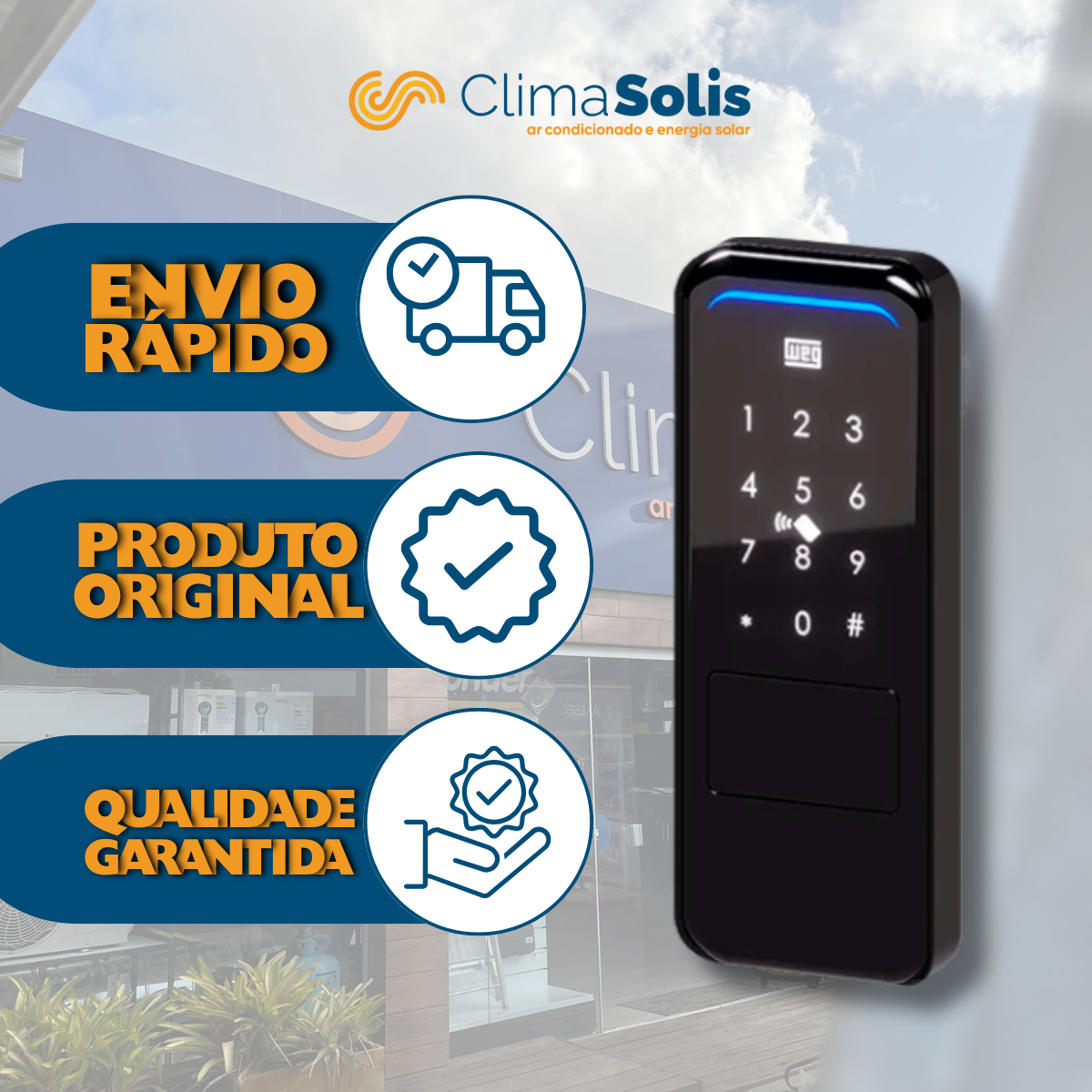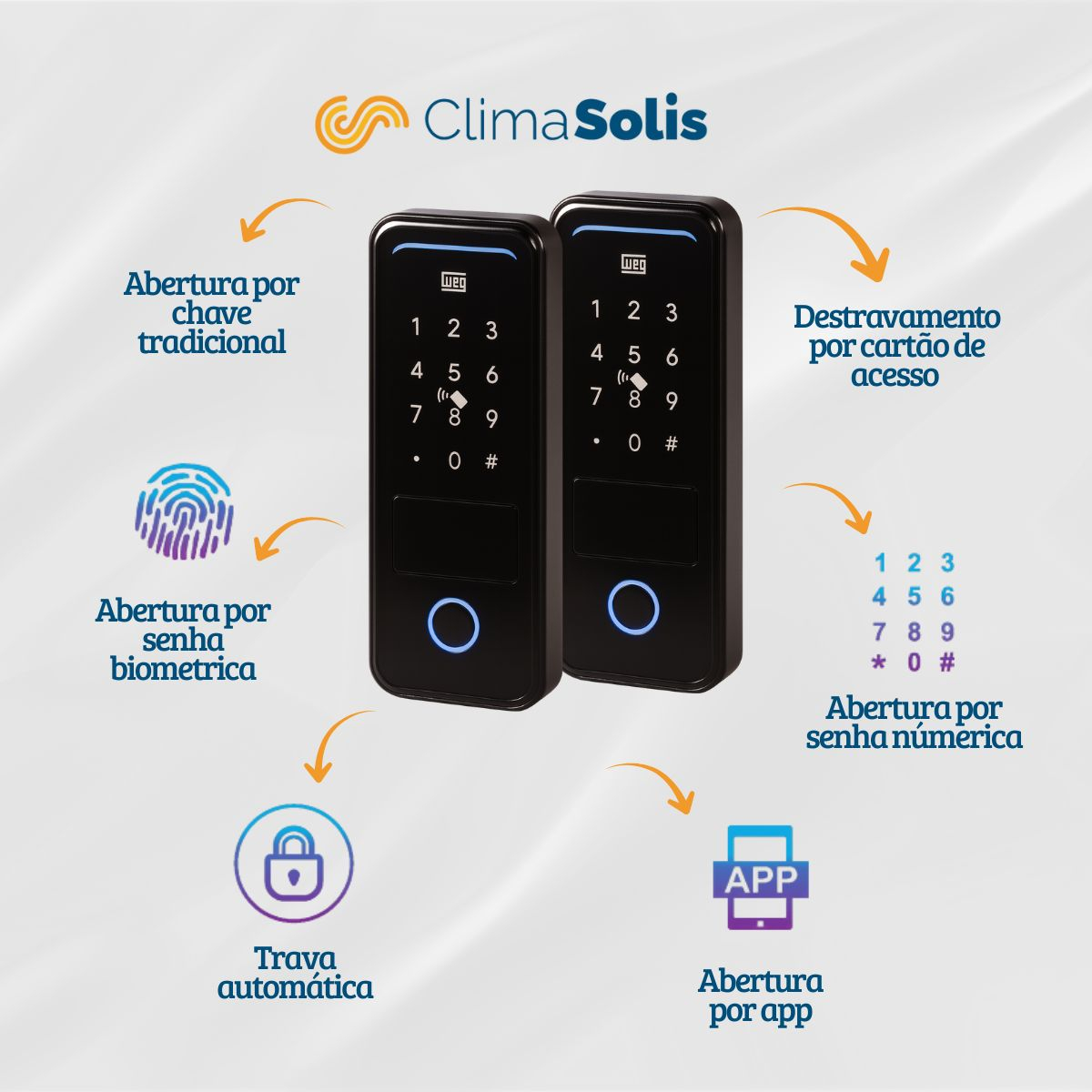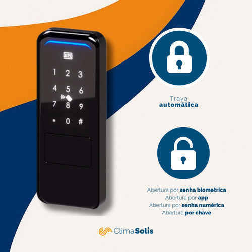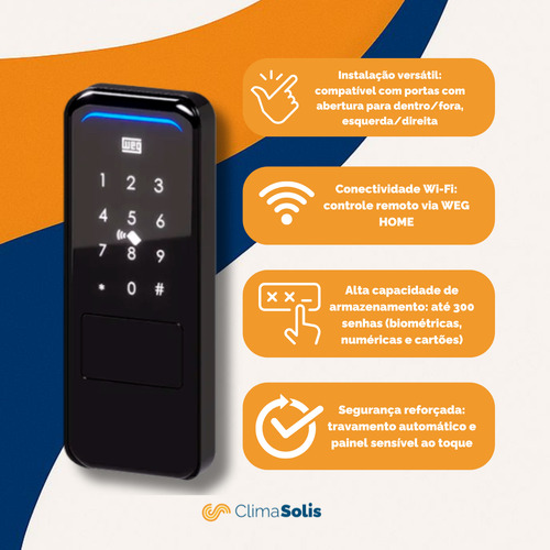 Este modelo se destaca pela variedade de métodos de abertura, pelo travamento automático e pela integração com o aplicativo WEG Home, que possibilita abertura remota e gerenciamento de usuários. Conta ainda com função campainha, alerta de bateria fraca, modo de acesso livre e certificação da Anatel, garantindo segurança e confiabilidade