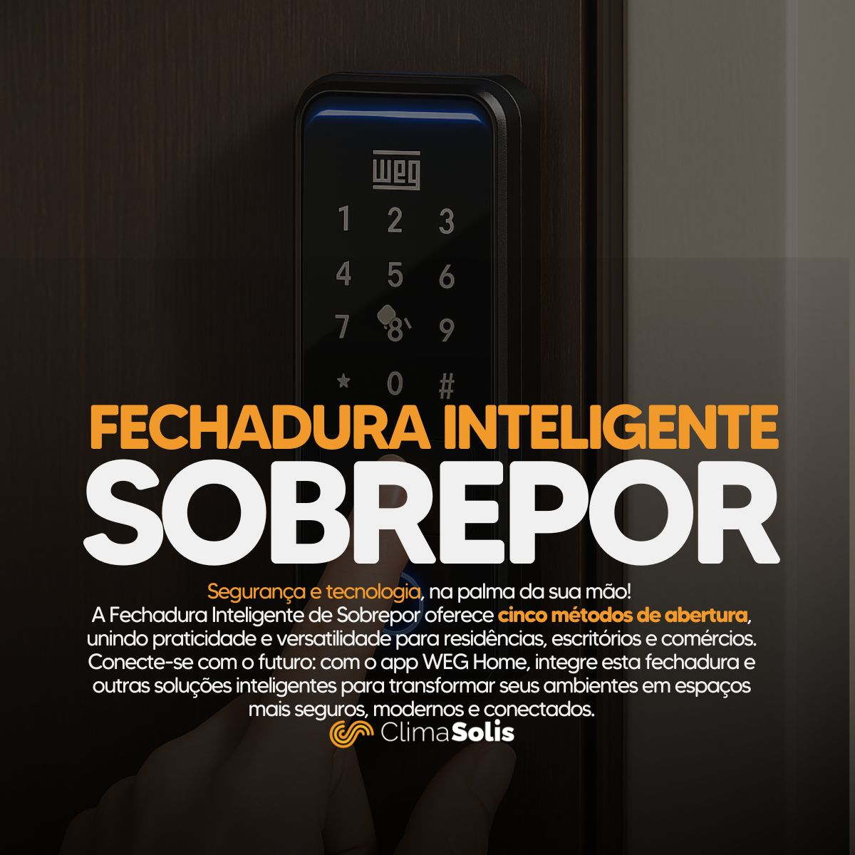 A Fechadura Wi-Fi de Sobrepor WEG Home foi projetada para unir tecnologia, segurança e praticidade em um único produto. Com ela, você pode trancar e destrancar sua porta de maneira moderna, utilizando biometria, senha numérica, cartão de acesso, chave mecânica ou diretamente pelo aplicativo WEG Home em seu celular. Tudo isso garante mais conforto e controle sobre o acesso à sua residência ou escritório.