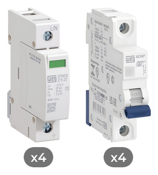 Kit 4 Protetores De Surto 275V 20ka Classe 2 + 4 Minidisjuntores Curva C 16a 1 Polo 400V WEG
