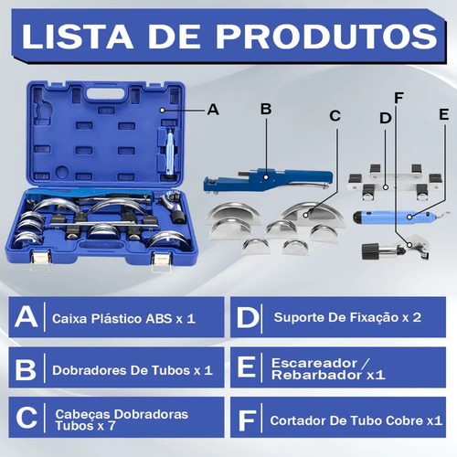 Com sete cabeças dobradoras intercambiáveis, você poderá trabalhar com tubos de diversos diâmetros: 1/4, 5/16, 3/8, 1/2, 5/8, 3/4 e 7/8 polegadas (6 a 22 mm). Isso significa que, não importa o tamanho do projeto, você terá sempre a ferramenta certa à mão.