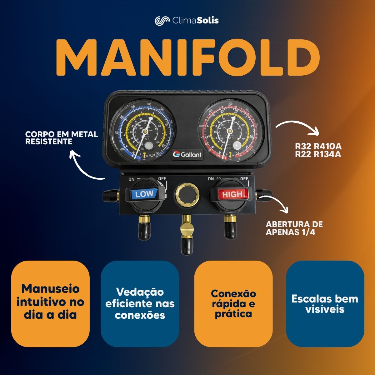 Kit Manifold Analógico Profissional R32 R410A R22 R134a com Mangueira 1,2m e Adaptador Pro Gallant