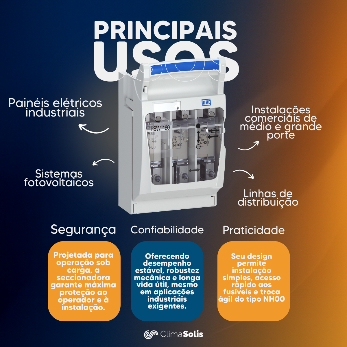 A Seccionadora FSW160-3 é indicada para uso em sistemas elétricos que exigem proteção confiável contra sobrecorrentes e curtos-circuitos. Pode ser utilizada em painéis elétricos, sistemas industriais, linhas de distribuição e em diversas instalações que necessitem de operação segura com fusíveis tipo NH.